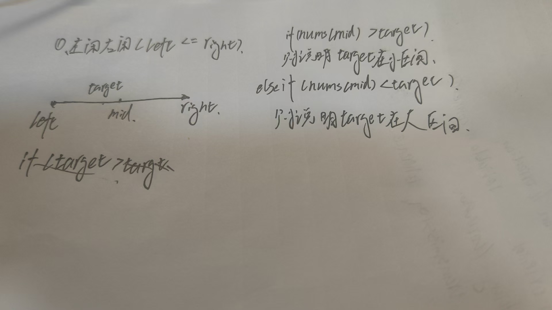 边界条件: left right时 由于左边和右边值相等 可以取 class Solution {public int search(int[] nums, int target) {int left 0;int right nums.length - 1;whi…