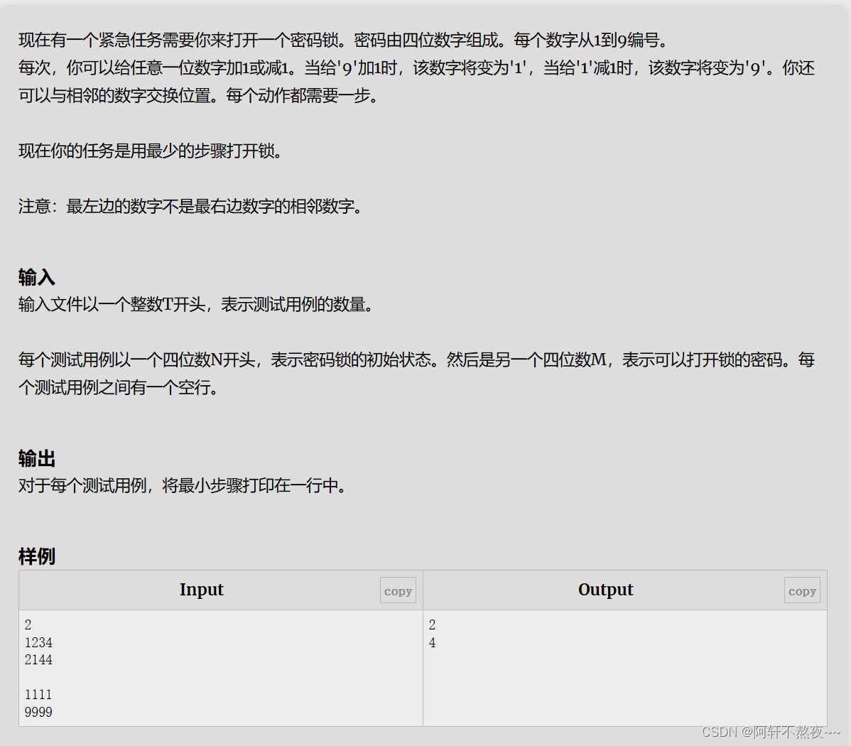 T - Open the Lock 这是一道bfs的搜索题,通过题目我们能够得到我们需要可以通过三种操作实现转化密码 1.任意数加1(大于9变成1) 2.任意数减1(小于1变成9) 3.交换任意两个数的位置.我们在bfs中分别枚举这几个操作即可. #include <iostream>
