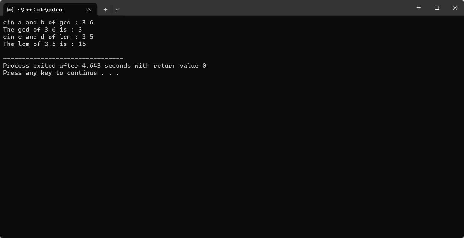 求最大公约数和最小公倍数 Coding : 使用C的库 #include<iostream> #include<algorithm> using namespace std; int main() { int a, b; cout << "cin a and b of gcd : "; cin >> a >> b; int res __gcd(a, b);…